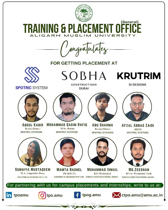 TNN News : Eight students from the Faculties of Commerce, Life Science, Engineering, and Social Sciences at Aligarh Muslim University (AMU) have secured placement in reputed organizations including Sobha Constructions, Dubai, Krutrim SI Designs, and Spotric Systems.