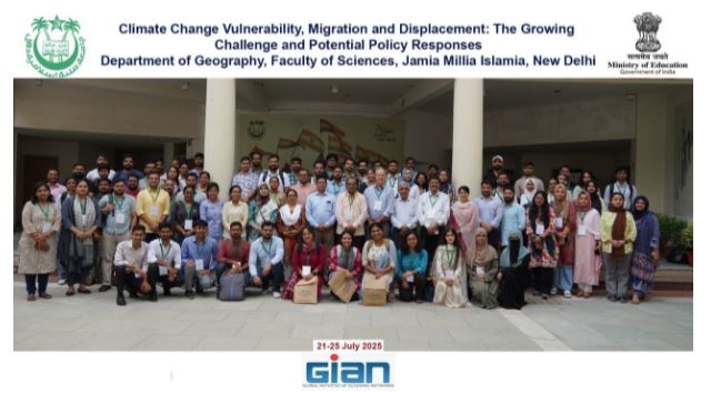 TNN News : The Department of Geography, Faculty of Sciences, Jamia Millia Islamia (JMI), in collaboration with Columbia University, New York, USA, successfully conducted a week-long Global Initiative for Academic Networks (GIAN) Course on “Climate Change Vulnerability, Migration and Displacement: The Growing Challenge and Potential Policy Responses” from 21 to 25 July, 2025. The course brought together leading academics, researchers, and policymakers to deliberate on one of the most pressing challenges of the 21st century; climate-induced displacement and mobility.