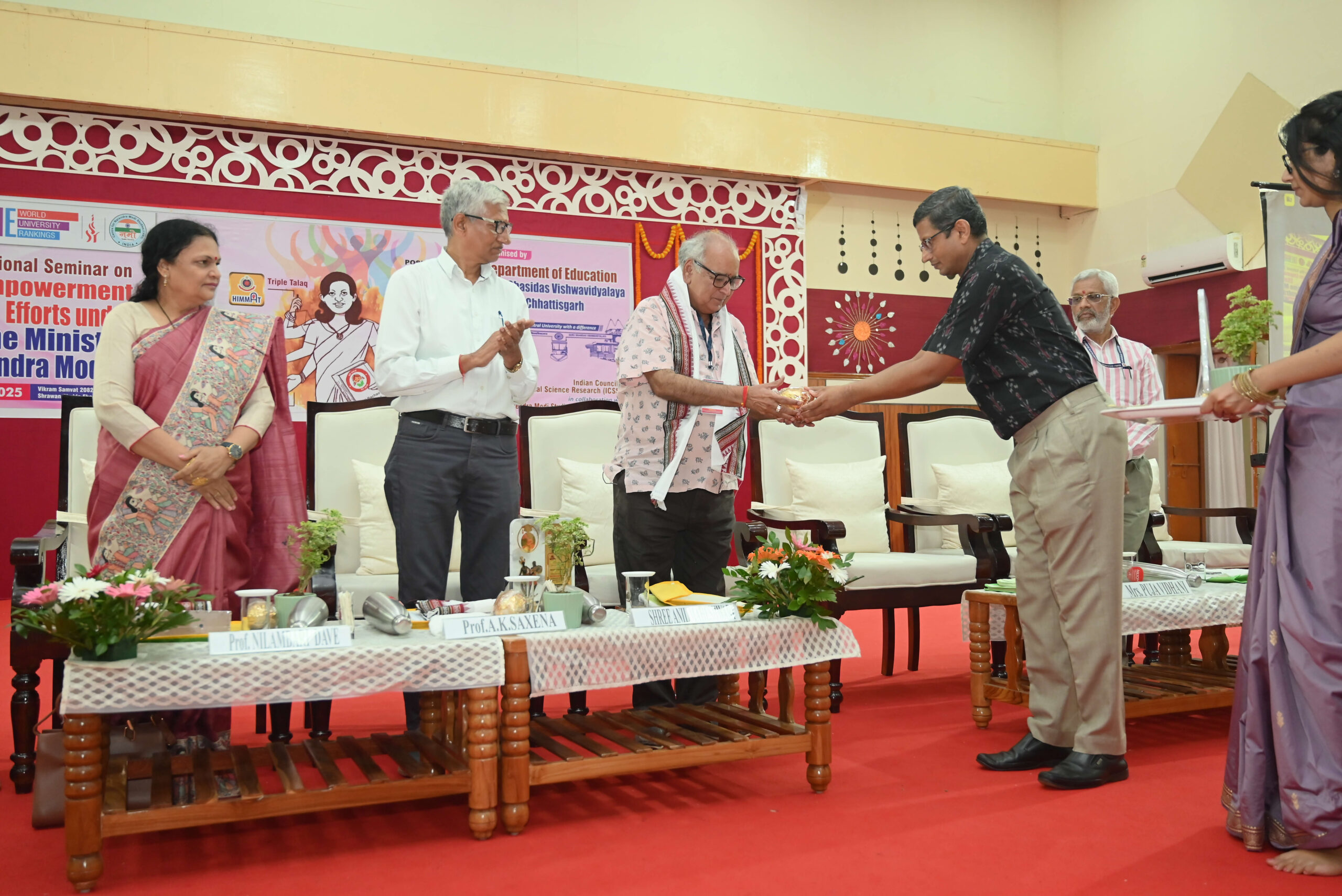 Dignitaries were greeted with saplings, mementos, and shawls as a mark of respect and gratitude. Prof. Sambit Kumar Padhi, Head of the Department of Education and Nodal Officer, Centre for Narendra Modi Studies (CNMS), GGV, delivered the welcome address and provided an overview of the seminar theme and objectives. The event commenced with lighting of the ceremonial lamp, followed by Saraswati Vandana and the University Kulgeet, creating an atmosphere of reverence and cultural pride.