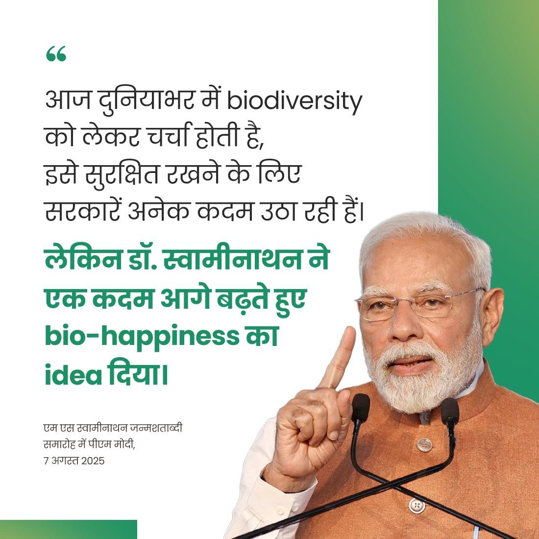 Prime Minister stated that while biodiversity is a topic of global discussion and governments are taking various steps to preserve it, Dr. M. S. Swaminathan went a step further by introducing the idea of biohappiness. He remarked that the gathering today is a celebration of that very idea. Quoting Dr. Swaminathan, who believed that the power of biodiversity could bring transformative change to the lives of local communities, Shri Modi highlighted that through the use of local resources, new livelihood opportunities could be created for people. He noted that true to his nature, Dr. Swaminathan had a unique ability to translate ideas into ground-level action. The Prime Minister emphasized that through his Research Foundation, Dr. Swaminathan consistently worked to ensure that the benefits of new discoveries reached farmers. He stated that small farmers, fisherfolk, and tribal communities greatly benefited from Dr. Swaminathan’s efforts.