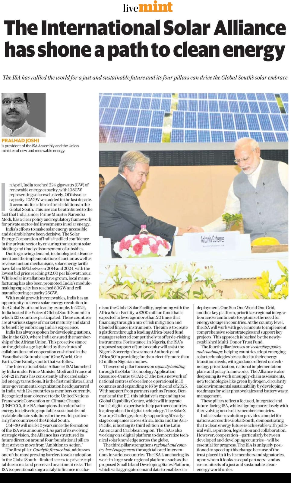 “केंद्रीय मंत्री श्री @JoshiPralhad लिखते हैं कि सौर ऊर्जा से वैश्विक ऊर्जा परिदृश्य में बदलाव आ रहा है, @isolaralliance न केवल भारत में बल्कि दुनिया भर में स्वच्छ ऊर्जा क्रांति को आगे बढ़ा रहा है।”